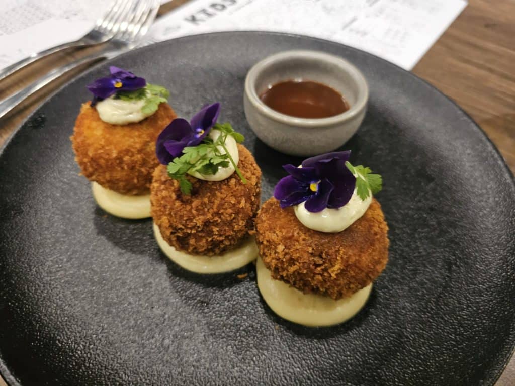 The crisp croquettes really hit the spot – ‘Futari’ Wagyu beef and smoked cheddar cheese croquette, with a potato emulsion, and Japanese BBQ sauce.