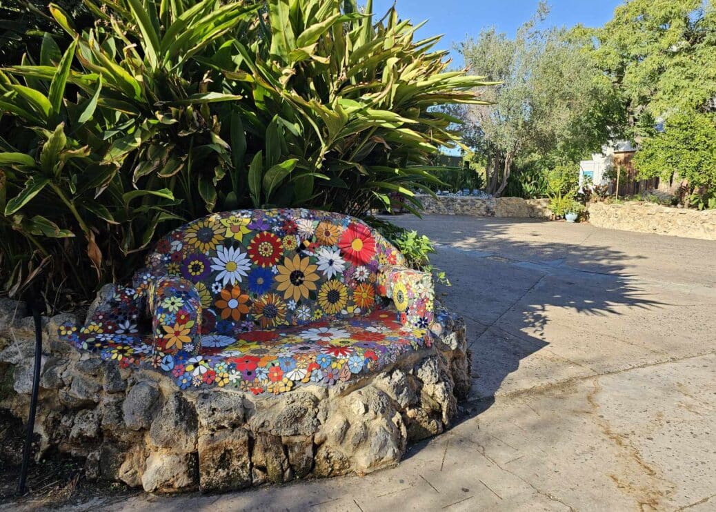 What makes this spot particularly appealing is the tranquil garden setting. After enjoying your meal, take time to wander through the lush grounds filled with flowers, herbs, and vibrant mosaic artworks. The garden has been thriving for about 30 years, established in 1994 as a permaculture project focused on education and the arts.