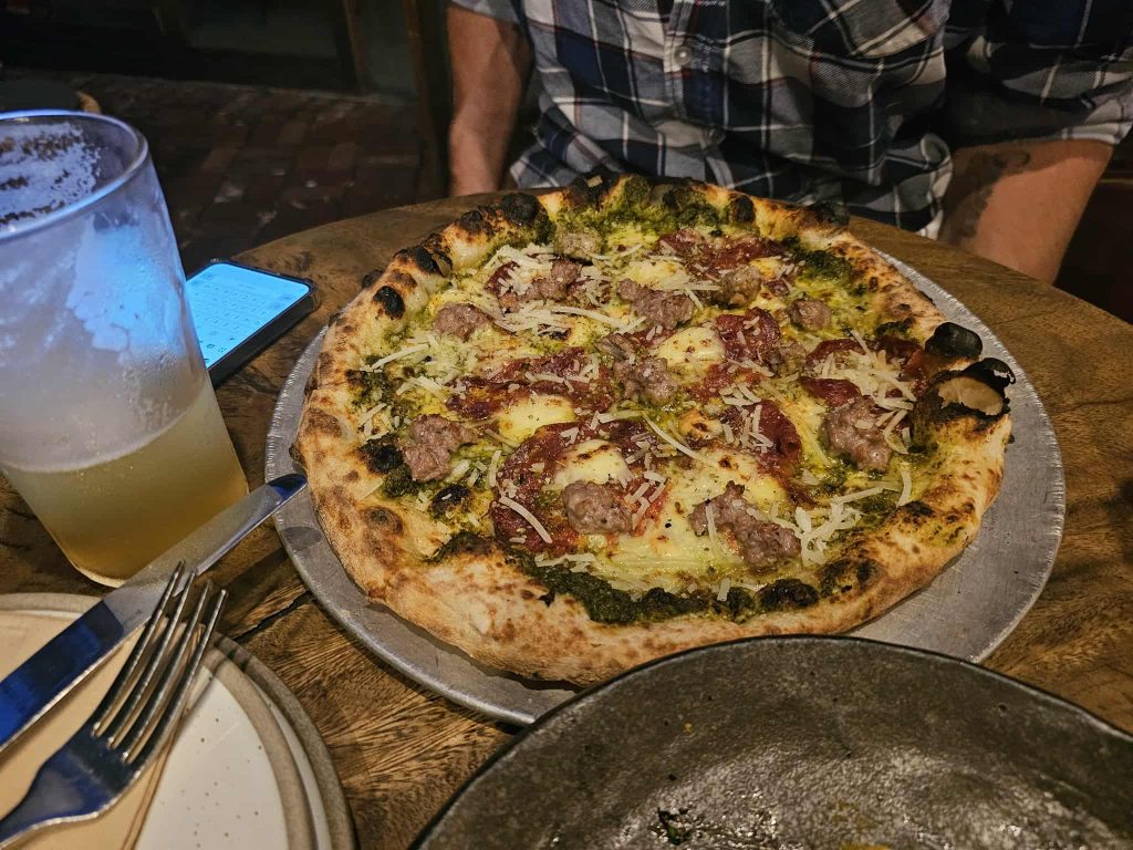 We enjoyed tender charred squid skewers, basted with a tasty nduja butter, a delicious broccolini dish, and an Italian sausage pizza with a vodka tomato sauce and plenty of cheese.