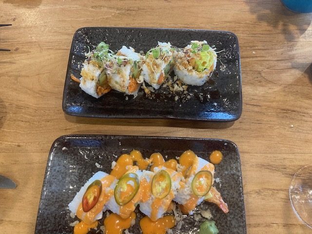 After a break we decided on two sushi dishes. Sushi is available in a dish of five or ten. Yasai ($20) and Volcano ($20). Yasai has vegetable fritters, cucumber, carrot, lettuce, tempura crunch, teriyaki sauce and sesame seeds while the Volcano has panko prawn, avocado, cream cheese, tempura crunch, super-hot mayo and fresh chilli. We were both disappointed in the sushi. The rolls were very thick, mainly with rice and the Yasai bland. I underestimated the heat of the super hot mayo and as a result my husband (aka asbestos mouth) managed three pieces while I had to leave mine.