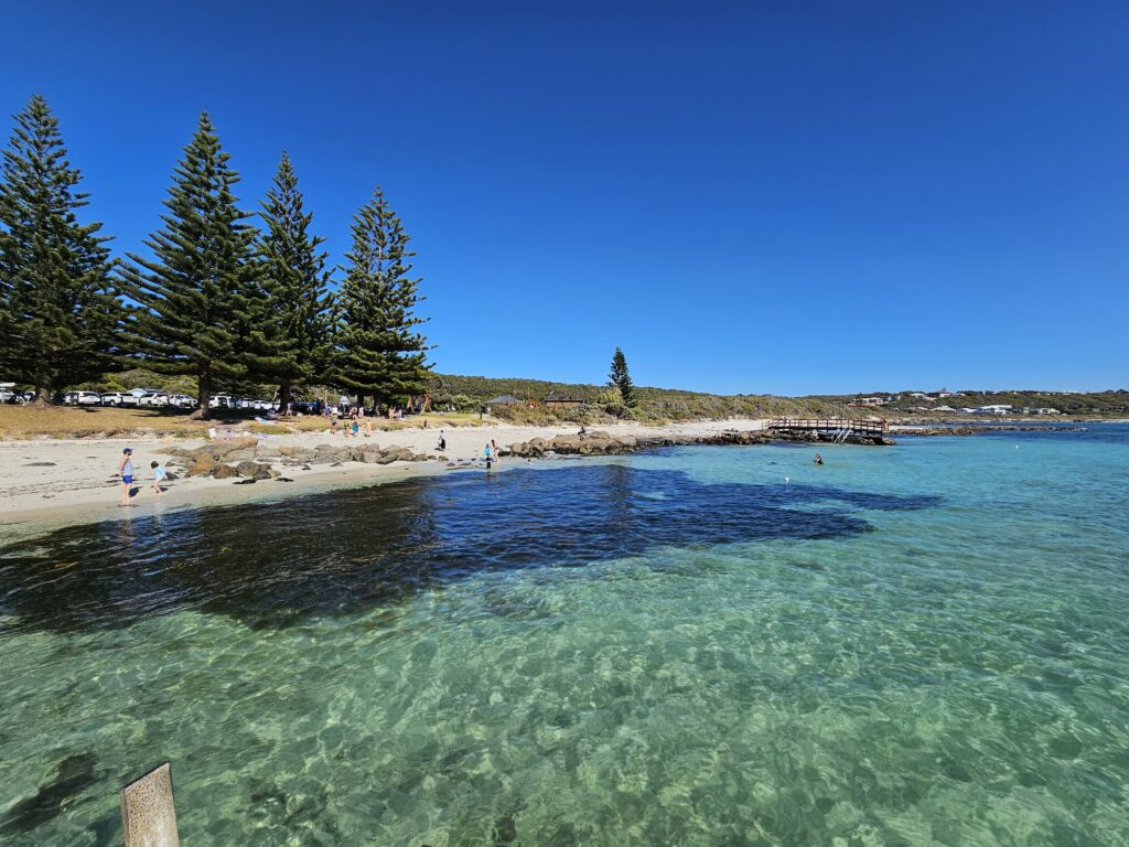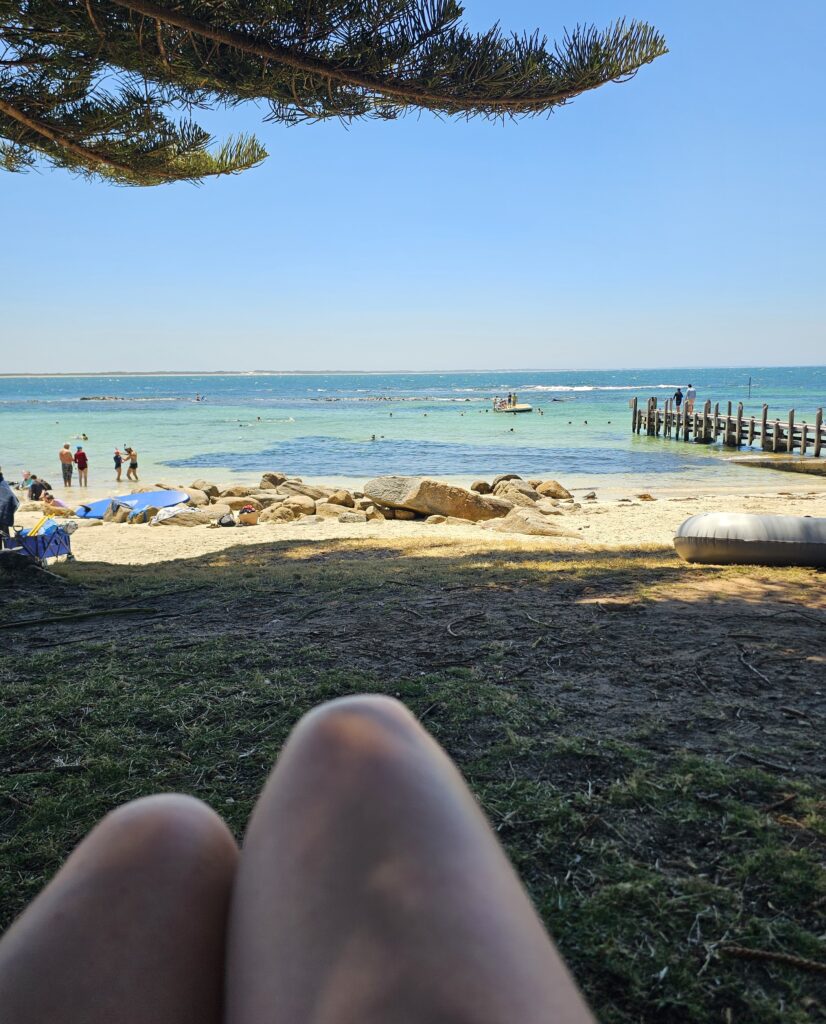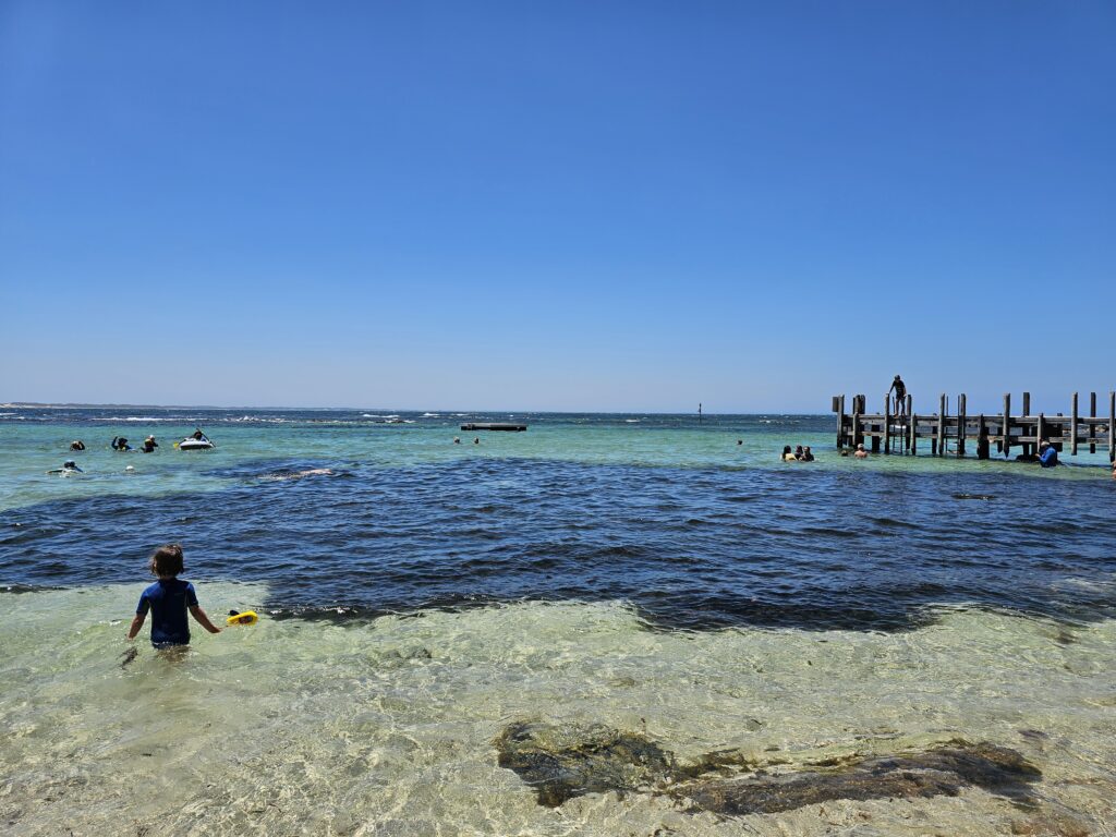 There’s a handy timber ramp, with steps into the water, so you don’t have to climb over slippery rocks or seaweed. We’ve visited in two Januarys and once the beach was clear, though in 2026 there was plenty of pesky seaweed. Kids like to jump from the jetty and pontoon.