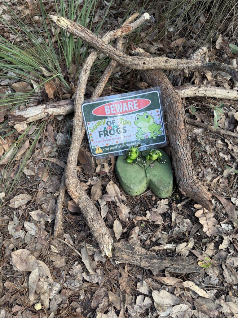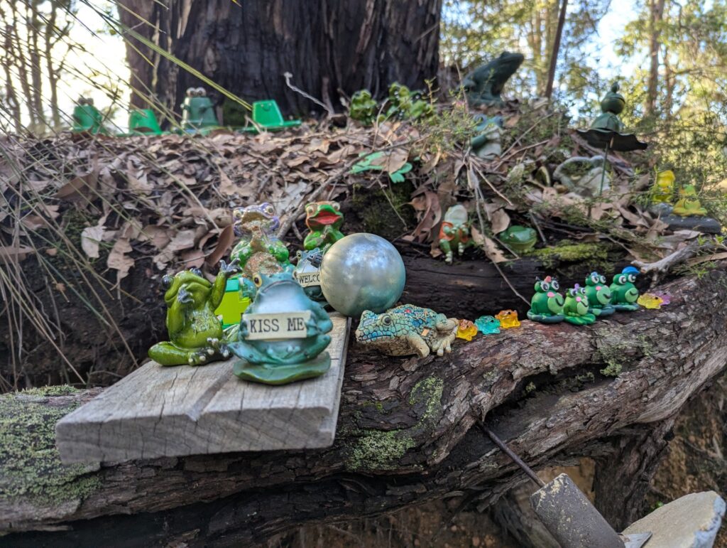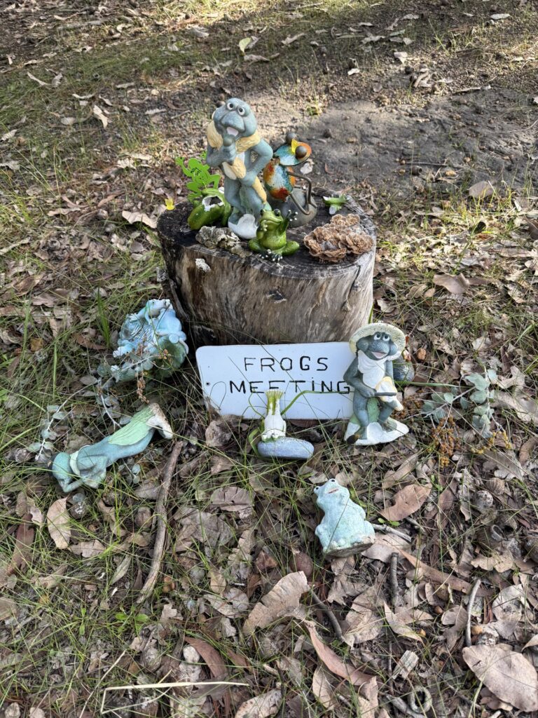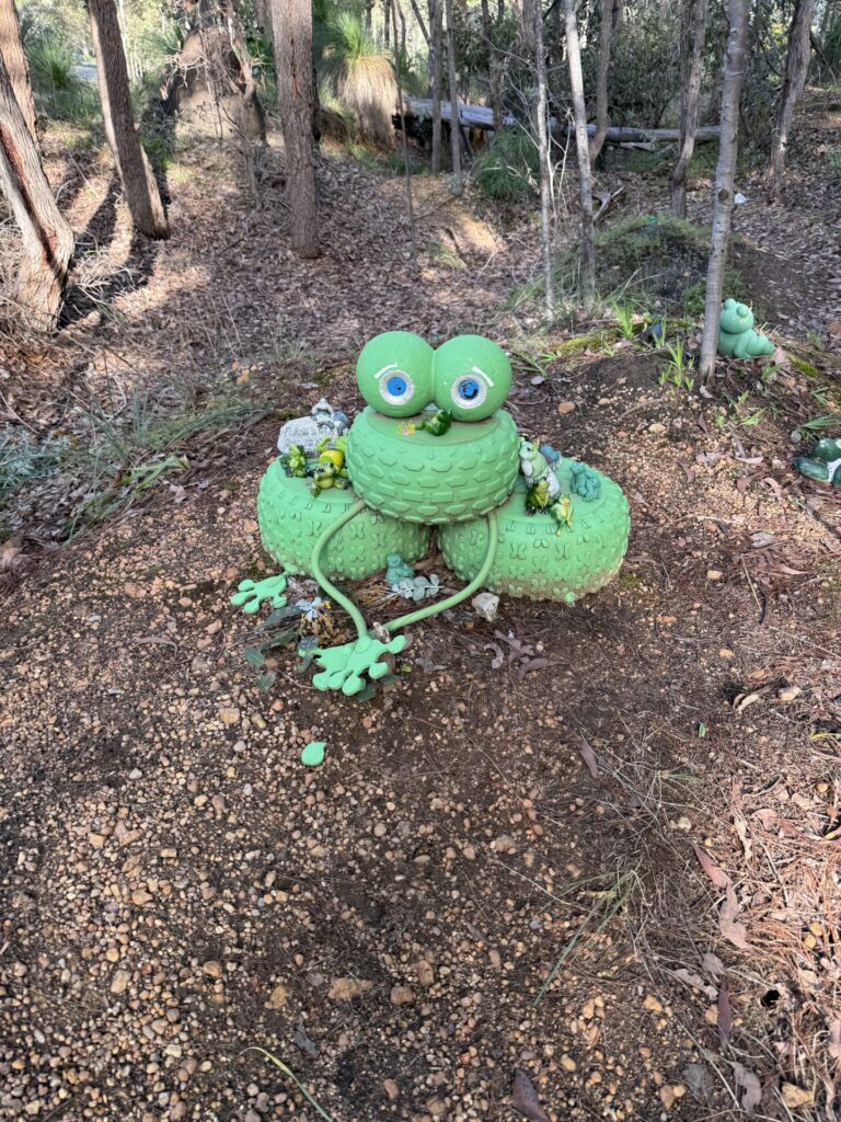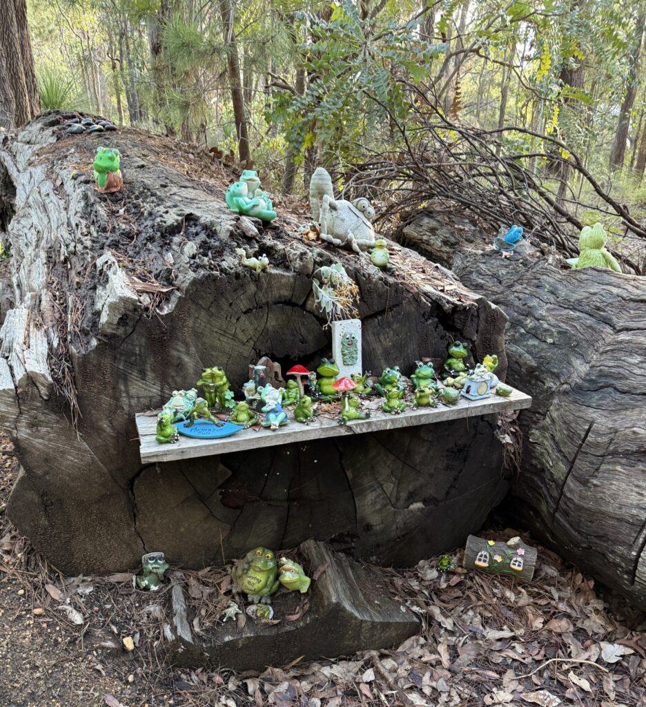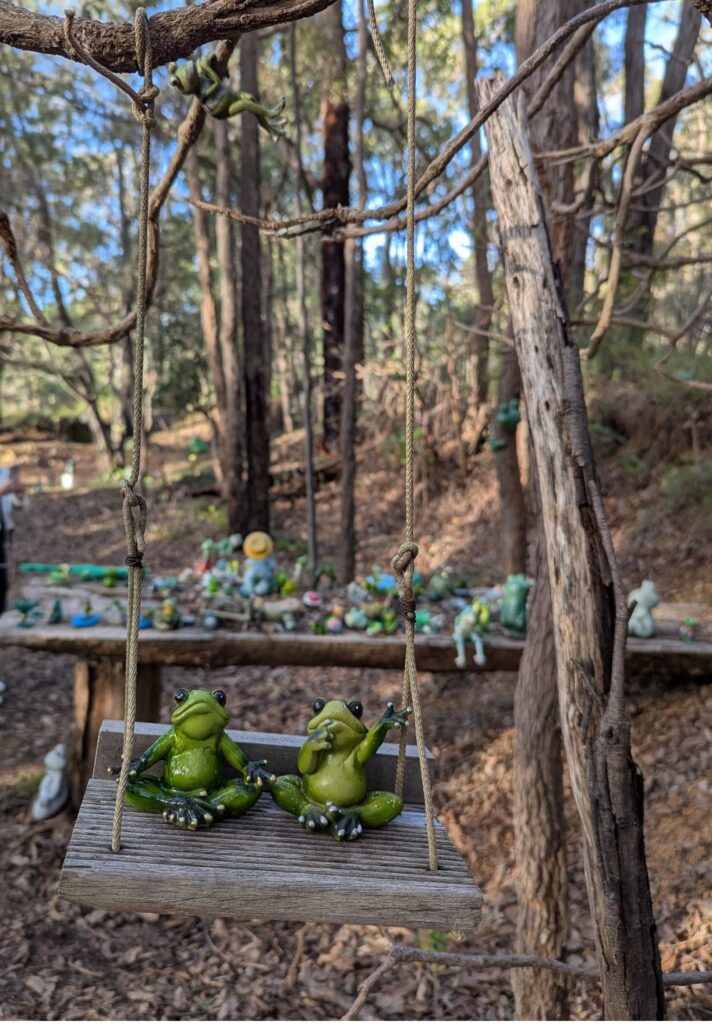Frog’s Hollow is a community-grown display dotted through the bush – peek beside shrubs, under rocks, in tree hollows and tucked into branches to spot the different “frog families.” It’s a simple pleasure, best enjoyed slowly, with time to wander, look closely, and have a laugh at the more eccentric amphibians.