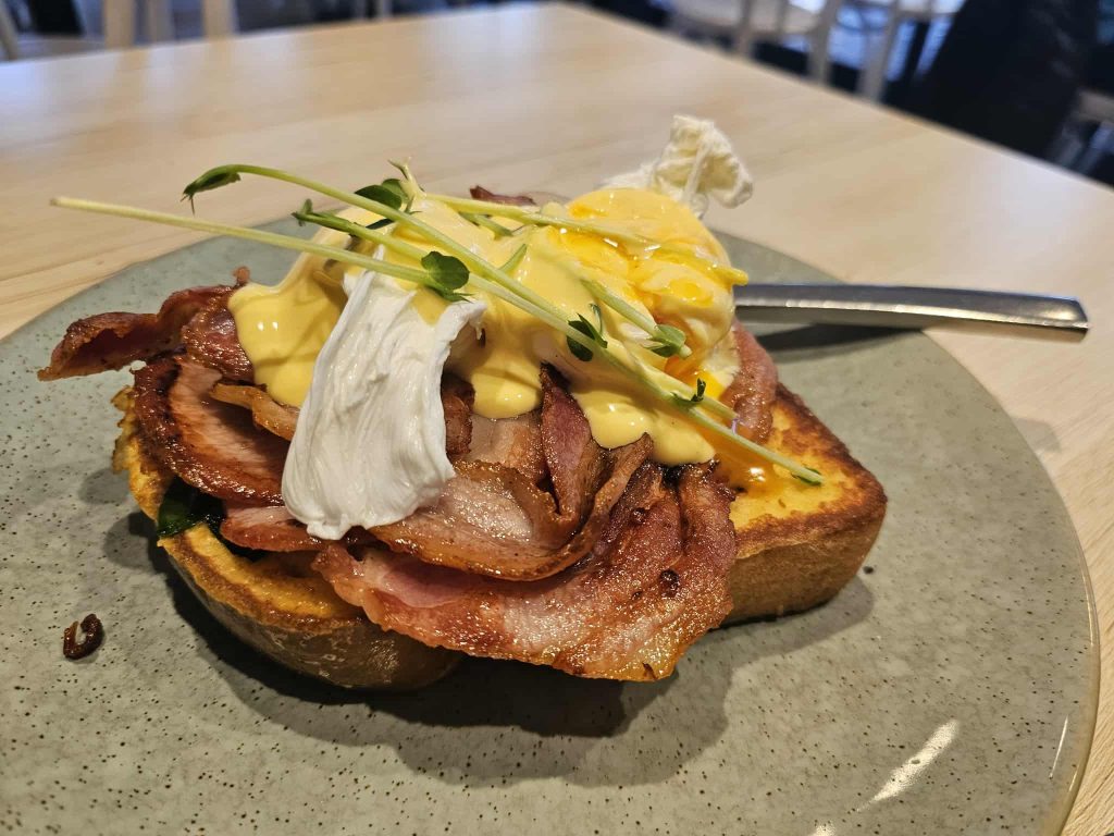 My son enjoyed the eggs benedict, served atop a thick slice of French toast, with perfectly poached eggs, plenty of crisp bacon rashers and a creamy hollandaise sauce.