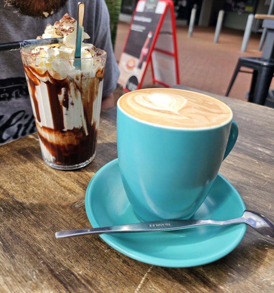 Not long after ordering, our drinks quickly came out – a flat white in a mug, plus an indulgent iced chocolate (which must always have cream and iced cream) for Mr H. Followed by a hearty brunch.