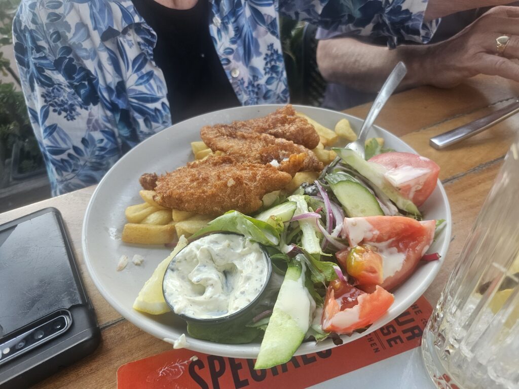 My parents both enjoyed fish and chips, and they were too hungry to pause for a photo, before starting. The crisp battered fish was fresh and full of flavour, accompanied by chips and a generous salad.