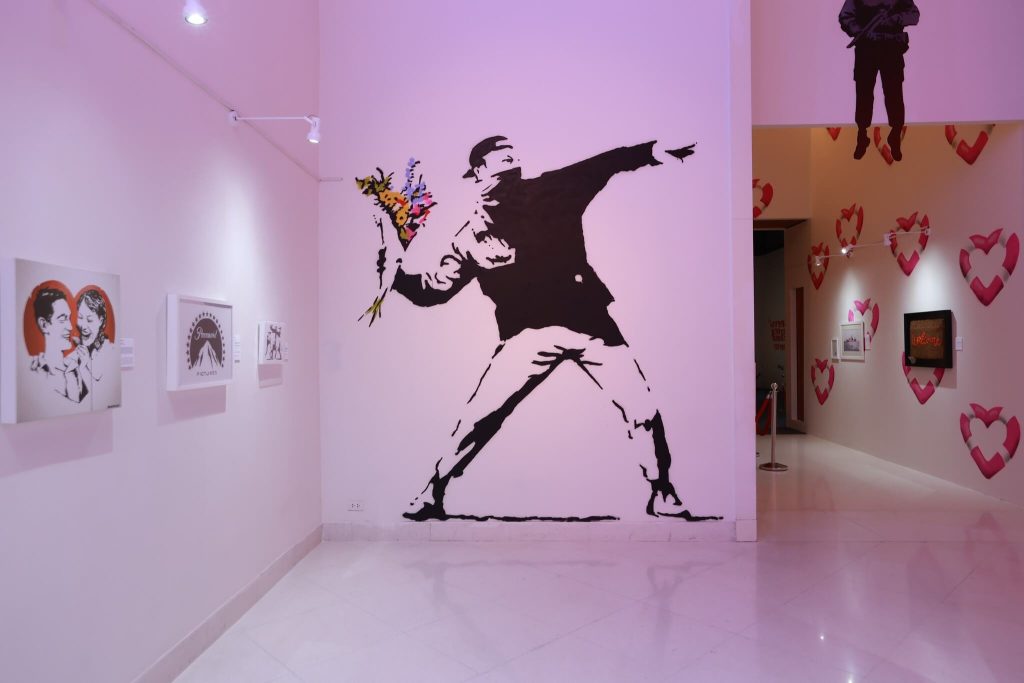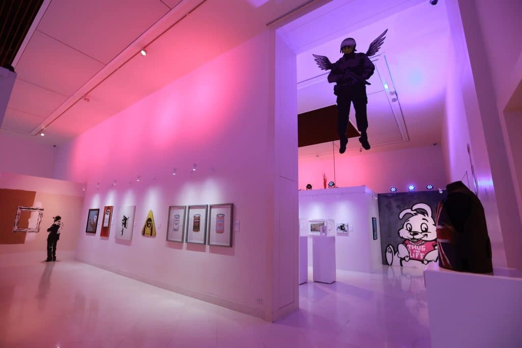 The display features a compelling mix of 95 original pieces alongside stencilled recreations (necessary due to the location and scale of some of his famous murals).