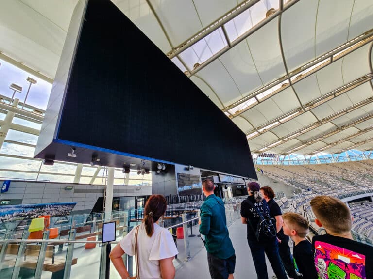 You’ll find yourself standing right underneath one of the stadium’s giant video screens. These are the largest stadium screens in the Southern Hemisphere, each a massive 340 square metres—big enough to build a house on! If you’re feeling peckish, the tour guide might let you in on a local secret: Coop & Co. Chicken on level five is said to have the best Butter Chicken in the stadium.