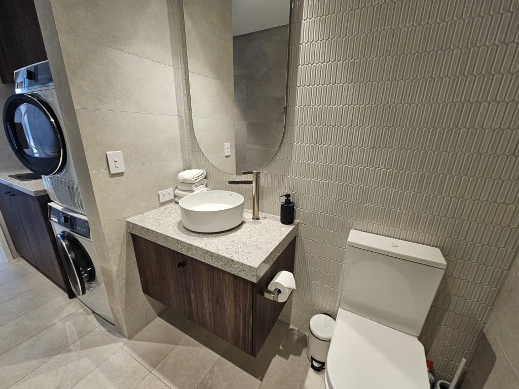 The sleek, well-lit bathroom is a highlight, with a rain shower with decent water pressure. This doubles as a handy laundry space with washing machine and dryer for longer stays.