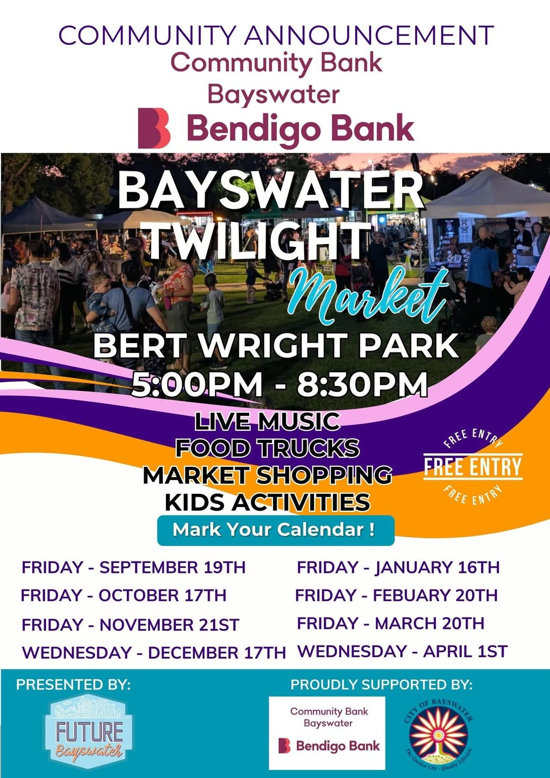 Bayswater Twilight Markets are BACK! Bert Wright Park is turning into a foodie & shopping paradise Friday Sept 19 then once a month till April! From 5:00 pm – 8:30 pm… Check out all the dates below. https://facebook.com/events/s/bayswater-twilight-market/1286412156270664/ Global flavours from Perth’s BEST food trucks Market stalls packed with treasures from local small businesses Live tunes to keep you grooving […]
