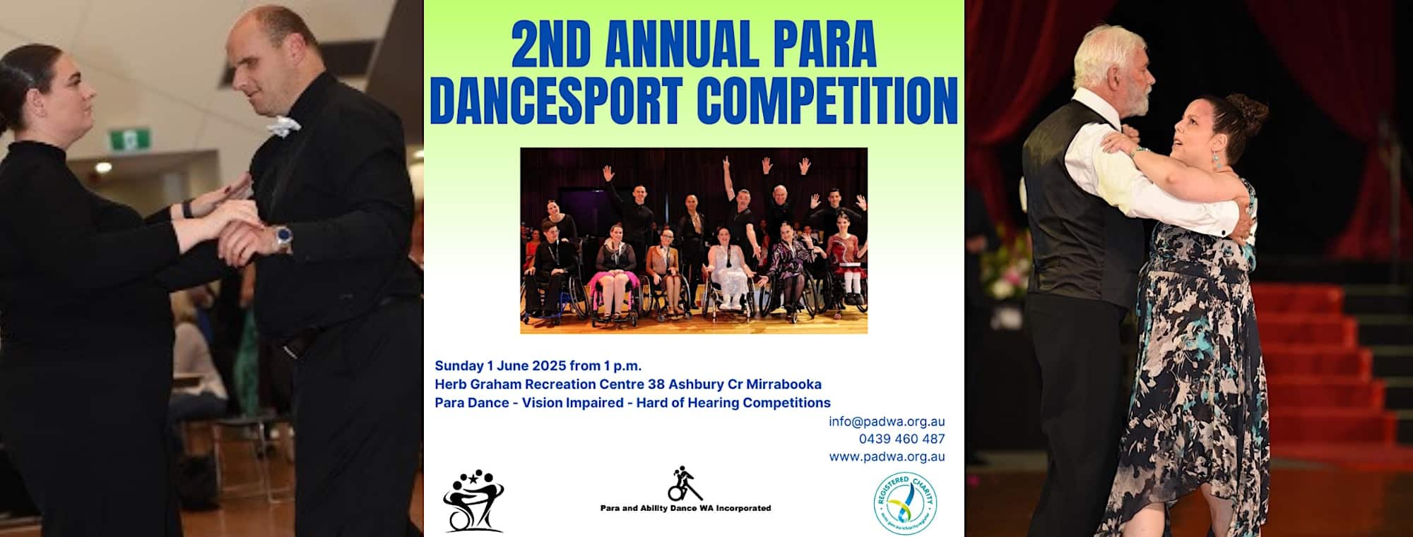 The Perth Para DanceSport Competition will be held on Sunday, 1 June 2025, from 1 to 5 p.m., at the Herb Graham Recreation Centre, 38 Ashbury Cres, Mirrabooka WA 6061, Australia.