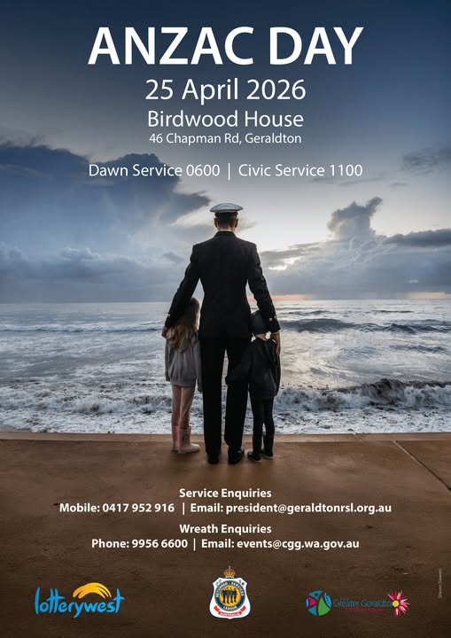 Dawn Service Date: April 25, 2026 Time: 6:00 AM - 7:00 AM Location: Forecourt Birdwood House Cnr Chapman Road & Forrest Street GERALDTON 6530 Gunfire Breakfast Date: April 25, 2026 Time: 7:00 AM - 8:00 AM Location: Birdwood House ANZAC Day March Date: April 25, 2026 Time: 10:45 AM - 11:00 AM Location: March From Dome Cafe to Birdwood House