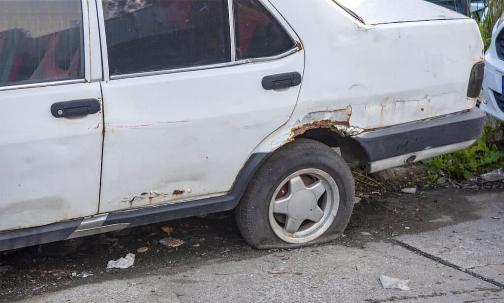 A white car sits on the street with a flat tire and visible rust on the rear wheel area.