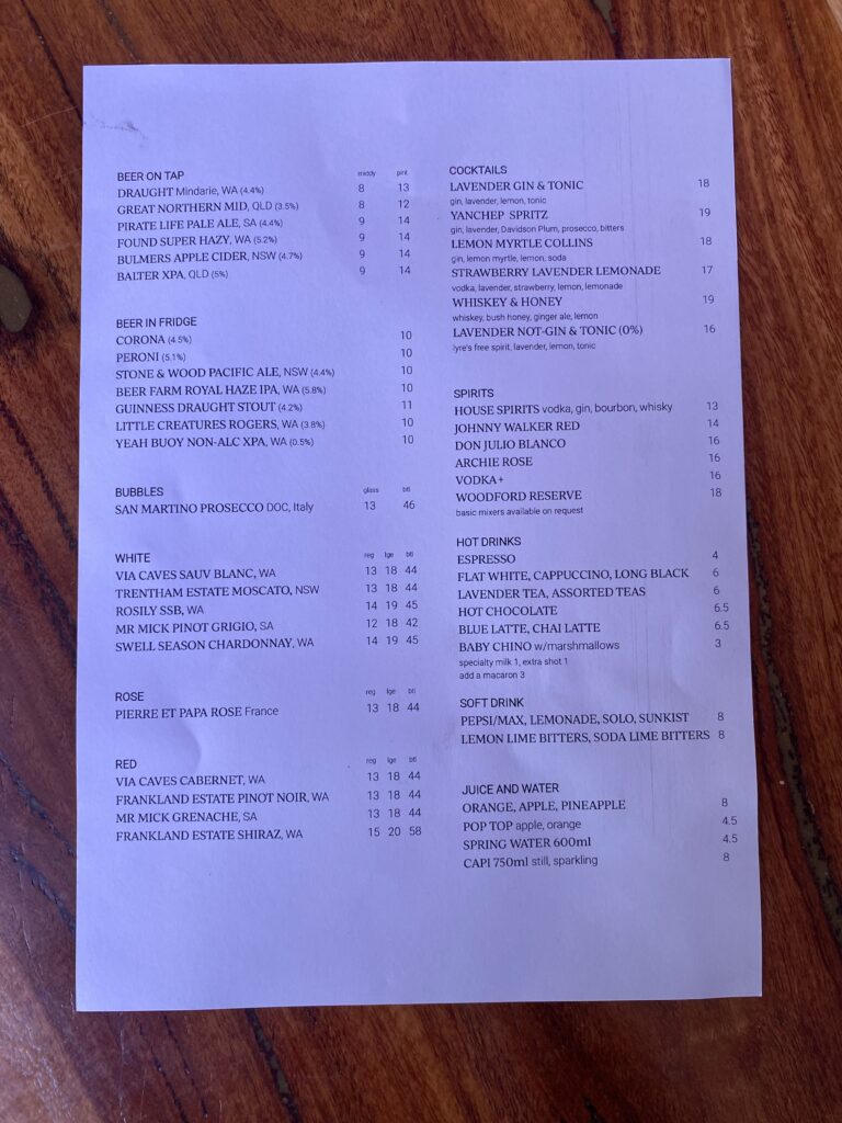 Lavender scones and ice cream are house favourites, and the drinks list features WA wines, craft beer and lavender‑inspired options.